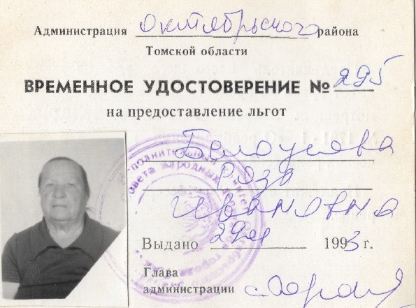 Удостоверение, выданное в 1993 г. Р.И. Белоусовой на предоставление льгот как репрессированной