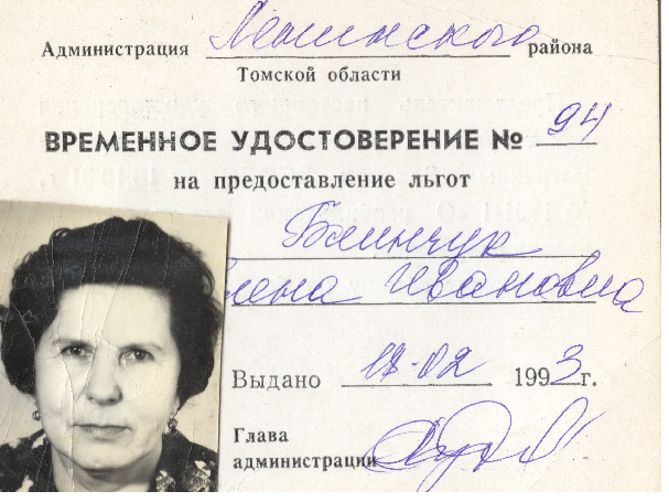 Удостоверение, выданное в 1993 г. Е.И. Блинчук на предоставление льгот как репрессированной