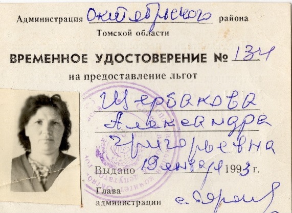 Удостоверение А.Г. Щербаковой на право получения льгот по Закону "О реабилитации жертв политических репрессий в СССР"