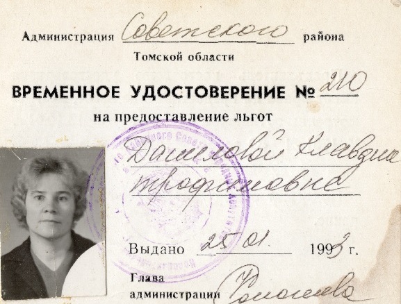 Удостоверение К.Т. Даниловой на право получения льгот по Закону "О жертвах политических репрессий в СССР"