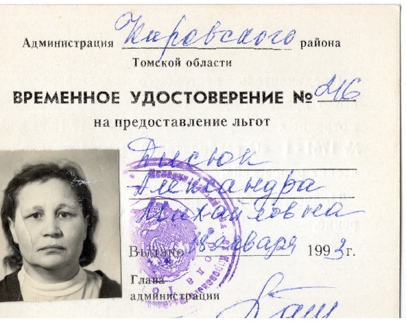 Удостоверение, выданное в 1993 г. Дисюк Александре Михайловне как признанной репрессированной.