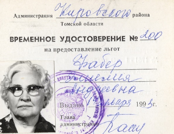 Удостоверение, выданное Э.А. Фабер на право получения льгот по Закону «О реабилитации жертв политических репрессий в СССР»