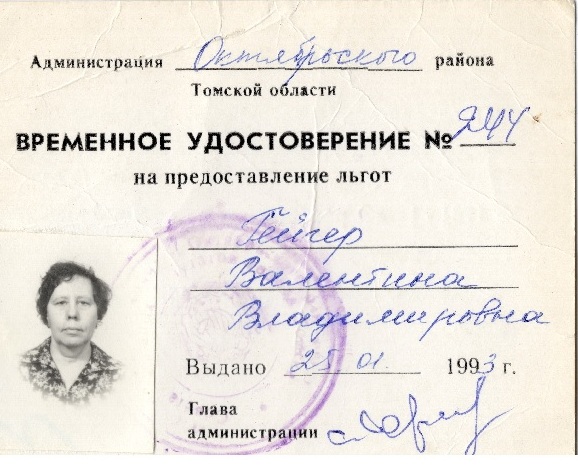 Удостоверение В.В. Гейгер на право получения льгот по Закону "О реабилитации жертв политических репрессий в СССР"