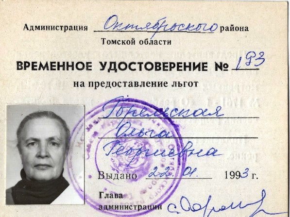 Удостоверение, выданное в 1993 г. О.Г. Горельской на право предоставление льгот как признанной подвергавшейся политическим репрессиям.