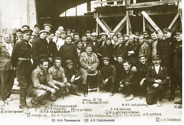 Коллектив ЦКБ-39 ОГПУ во время посещения В. Р. Менжинским. Здесь все вместе: и заключенные, и вольнонаемные, и охранники. 1931 г. А.Г. Горянов-Горный - крайний справа под №12. Архив Л. Л. Кербера.