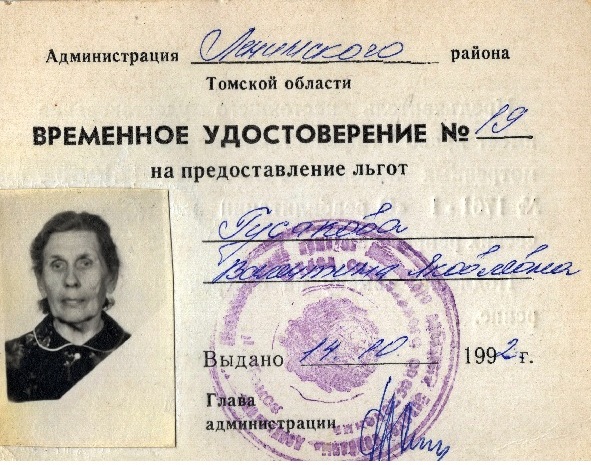 Удостоверение В.Я. Гусаковой на право получения льгот по Закону "О реабилитации жертв политических репрессий"
