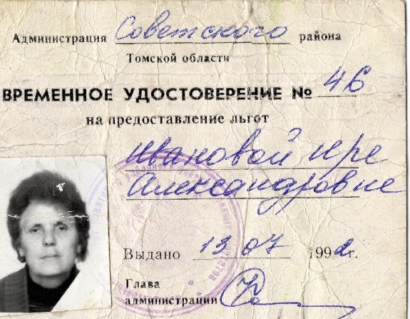 Удостоверение, выданное И.А. Ивановой в 1992 г. на право получения льгот согласно Закона "О реабилитации жертв политических репрессий"