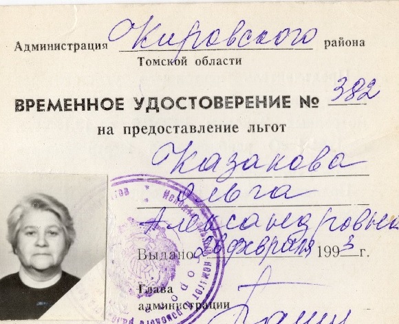 Удостоверение О.А. Казаковой на право получения льгот по Закону "О реабилитации жертв политических репрессий в СССР"