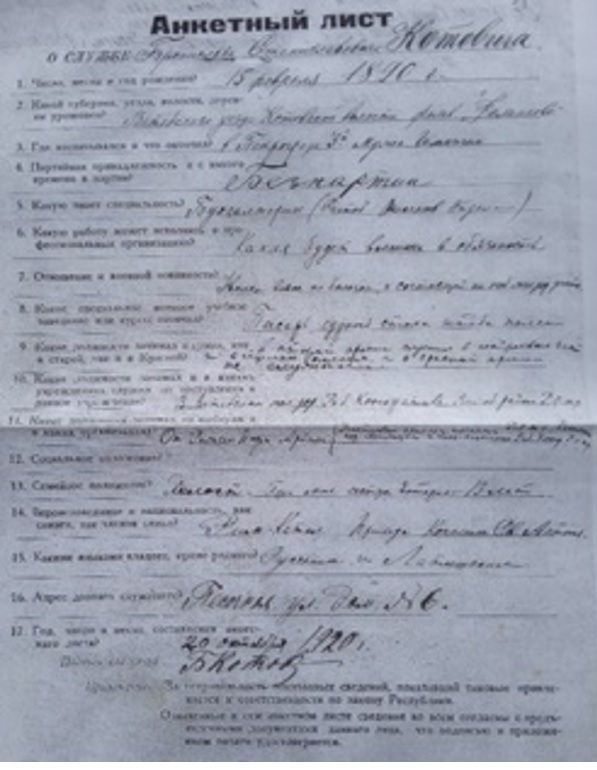 Анкетный лист о службе Б. Котовича от 1920 г.