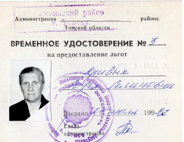 Удостоверен6ие, выданное С.С. Кривых на право получения льгот как репрессированной