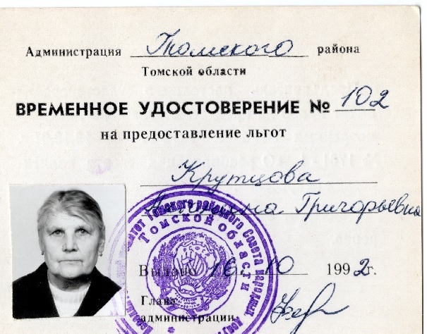Удостоверение, выданное А. Г. Крутцовой на право получения льгот по Закону «О реабилитации жертв политических репрессий в СССР»