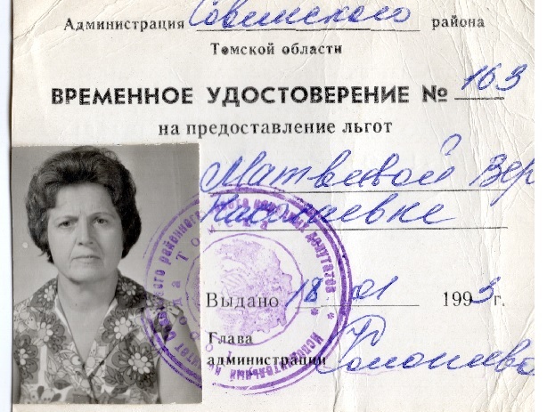 Удостоверение В.Н. Матвеевой на право получения льгот по Закону "О реабилиации жертв политических репрессий в СССР"
