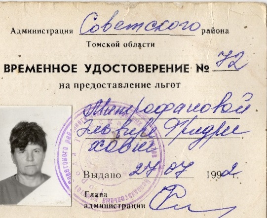 Удостоверение, выданное Э.Ф. Митрофановой на право получения льгот по Закону «О реабилитации жертв политических репрессий в СССР»