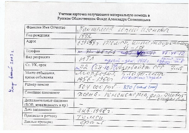 Учетная карточка Фонда А.И. Солженицына на Ю.И. Пантелеева
