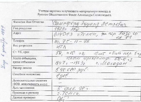 Учетная карточка Фонда А.И. Солженицына на А.П. Самсфорда.