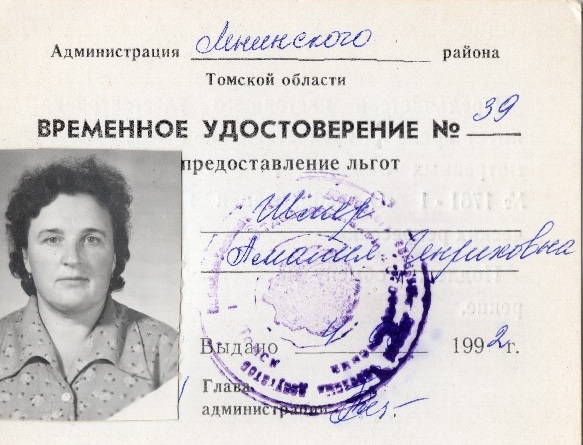 Удостоверение, выданное А.Г. Шмер на право получения льгот по Закону «О реабилитации жертв политических репрессий в СССР»
