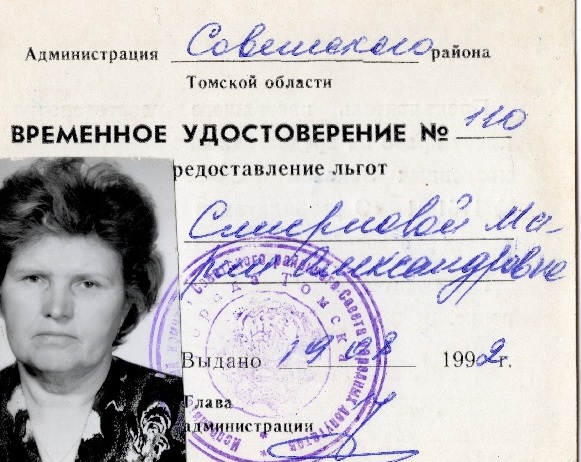 Удостоверение, выданное М.А. Смирновой на право получения льгот по Закону «О реабилитации жертв политических репрессий в СССР»
