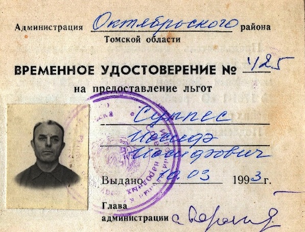 Удостоверение И.И. Суппеса на право получения льгот по Закону "О реабилитации жертв политических репрессий в СССР"