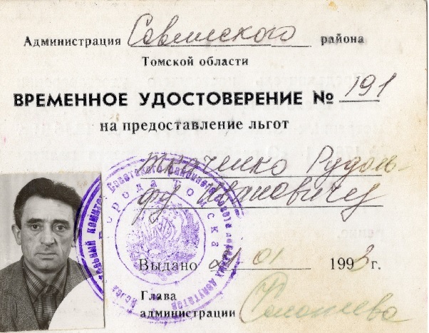 Удостоверение, выданное Р.И. Ткаченко в 1993 г. как имеющему право на предоставление льгот как репрессированному