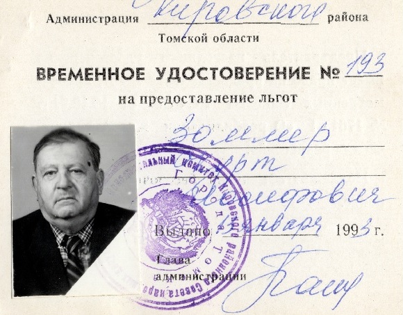 Временное удостоверение, выданное К.И. Зоммеру после его реабилитации